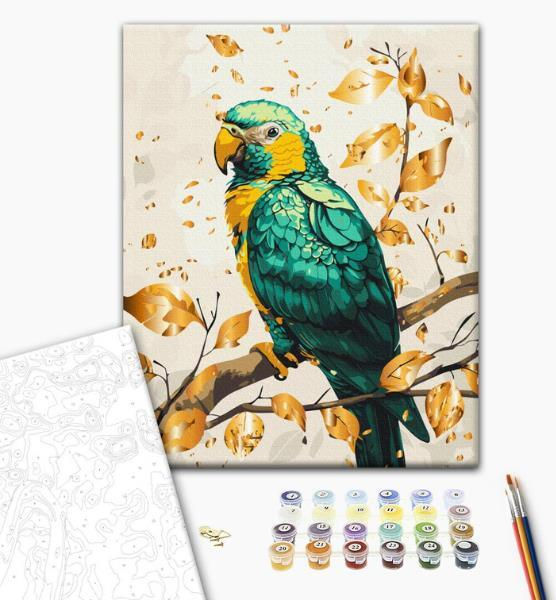გასაფერადებელი ნომრებით BrushMe BS54123 Emerald parrot with metallic colors 40*50სმ. ტილო, აკრილის საღ, ფუნჯი